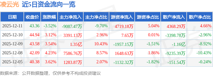 证券之星消息,截至2025年12月11日收盘,凌云光(688400)报收于43.36元,下跌3.52%,换手率4.61%,成交量21.25万手,成交额9.37亿元。