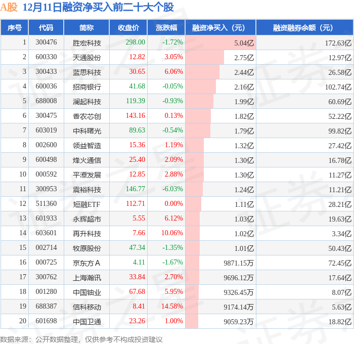 A股融资净买入前三分别为:胜宏科技(300476)融资净买入5.04亿元、天通股份(600330)融资净买入2.75亿元、蓝思科技(300433)融资净买入2.44亿元,前20具体见下表: