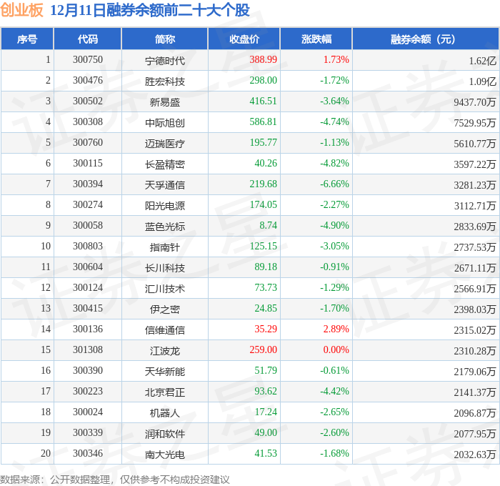 创业板融券余额前三分别为:宁德时代(300750)融券余额1.62亿元、胜宏科技(300476)融券余额1.09亿元、新易盛(300502)融券余额9437.7万元,前20具体见下表: