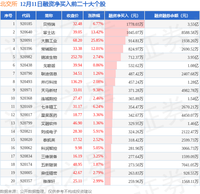 北交所融资净买入前三分别为:贝特瑞(920185)融资净买入1778.03万元、富士达(920640)融资净买入1045.07万元、大鹏工业(920091)融资净买入914.81万元,前20具体见下表: