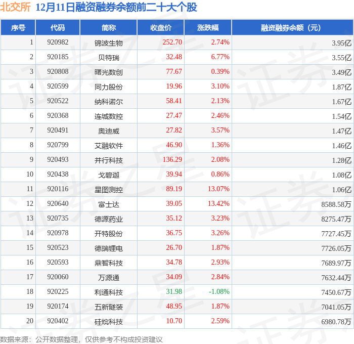 北交所融资融券余额前三分别为:锦波生物(920982)融资融券余额3.95亿元、贝特瑞(920185)融资融券余额3.55亿元、曙光数创(920808)融资融券余额3.49亿元,前20具体见下表: