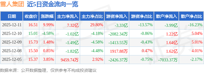 证券之星消息,截至2025年12月11日收盘,雪人集团(002639)报收于16.51元,上涨9.99%,涨停,换手率23.81%,成交量154.9万手,成交额24.57亿元。