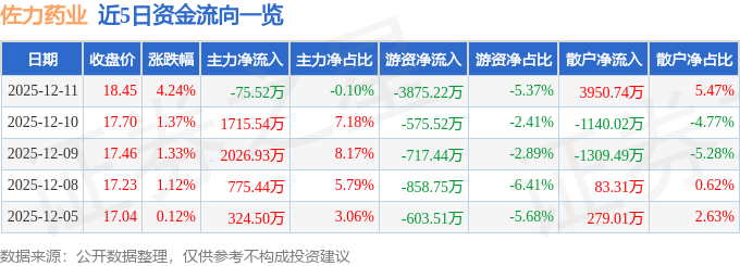 证券之星消息,截至2025年12月11日收盘,佐力药业(300181)报收于18.45元,上涨4.24%,换手率6.51%,成交量39.23万手,成交额7.22亿元。
