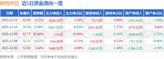 证券之星消息,截至2025年12月11日收盘,陕西华达(301517)报收于62.09元,上涨4.21%,换手率21.88%,成交量21.48万手,成交额13.14亿元。