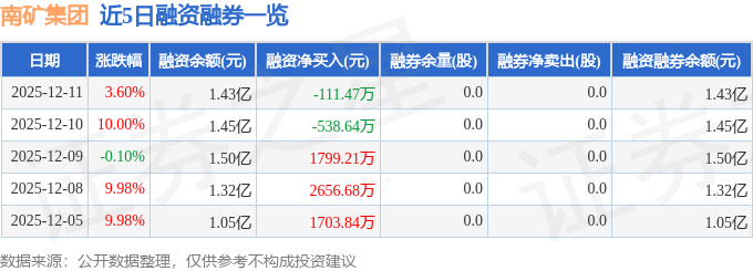 南矿集团融资融券信息显示,融资方面,当日融资买入8493.87万元,融资偿还8605.35万元,融资净偿还111.47万元。融券方面,融券卖出0.0股,融券偿还0.0股,融券余量0.0股,融券余额0.0万元。融资融券余额1.43亿元。