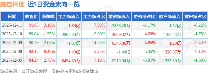 证券之星消息,截至2025年12月11日收盘,捷佳伟创(300724)报收于91.85元,上涨3.16%,换手率9.12%,成交量26.23万手,成交额24.38亿元。