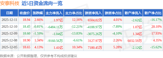 12月11日的资金流向数据方面,主力资金净流入1.97亿元,占总成交额12.16%,游资资金净流入6504.02万元,占总成交额4.01%,散户资金净流出2.62亿元,占总成交额16.17%。