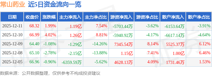 证券之星消息,截至2025年12月11日收盘,常山药业(300255)报收于68.32元,上涨1.99%,换手率2.52%,成交量23.15万手,成交额15.73亿元。