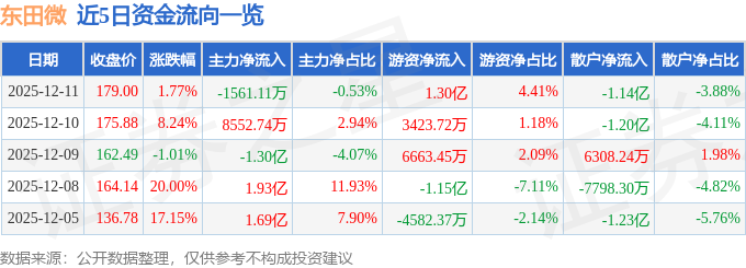证券之星消息,截至2025年12月11日收盘,东田微(301183)报收于179.0元,上涨1.77%,换手率28.23%,成交量16.55万手,成交额29.45亿元。