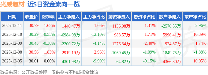 证券之星消息,截至2025年12月11日收盘,光威复材(300699)报收于30.79元,上涨1.65%,换手率3.44%,成交量28.28万手,成交额8.69亿元。
