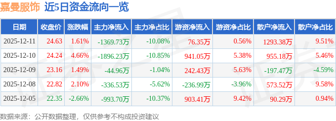 证券之星消息,截至2025年12月11日收盘,嘉曼服饰(301276)报收于24.63元,上涨1.61%,换手率12.03%,成交量5.54万手,成交额1.36亿元。
