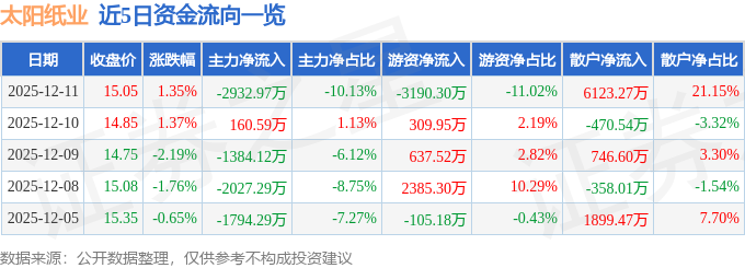证券之星消息,截至2025年12月11日收盘,太阳纸业(002078)报收于15.05元,上涨1.35%,换手率0.69%,成交量19.06万手,成交额2.89亿元。