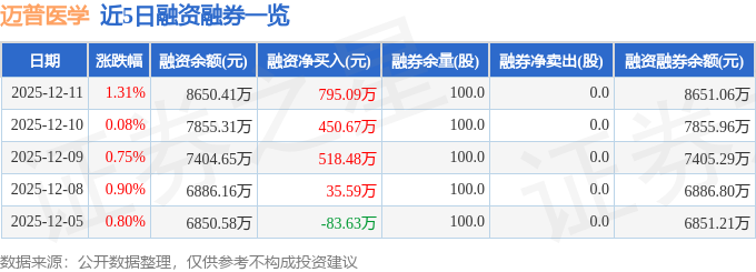 迈普医学融资融券信息显示,融资方面,当日融资买入1203.14万元,融资偿还408.05万元,融资净买入795.09万元,连续3日净买入累计1764.24万元。融券方面,融券卖出0.0股,融券偿还0.0股,融券余量100.0股,融券余额0.65万元。融资融券余额8651.06万元。