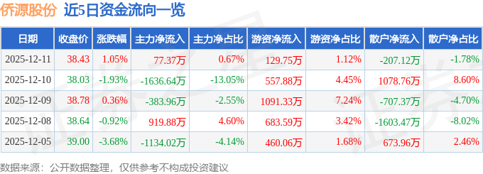 证券之星消息,截至2025年12月11日收盘,侨源股份(301286)报收于38.43元,上涨1.05%,换手率1.88%,成交量3.02万手,成交额1.16亿元。