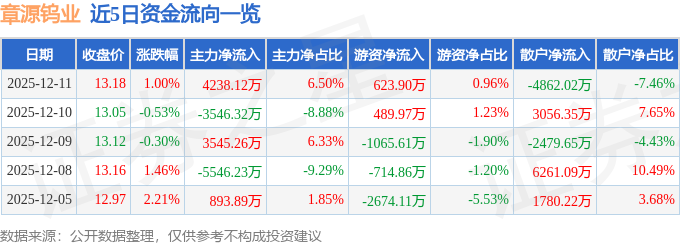证券之星消息,截至2025年12月11日收盘,章源钨业(002378)报收于13.18元,上涨1.0%,换手率4.12%,成交量49.18万手,成交额6.52亿元。