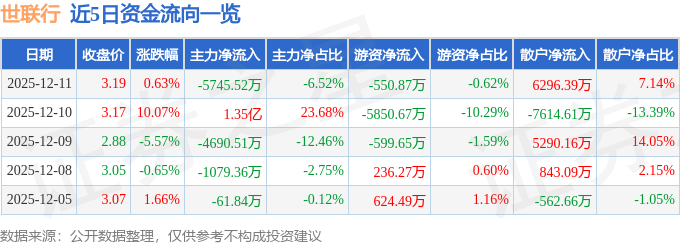 证券之星消息,截至2025年12月11日收盘,世联行(002285)报收于3.19元,上涨0.63%,换手率13.78%,成交量272.34万手,成交额8.82亿元。