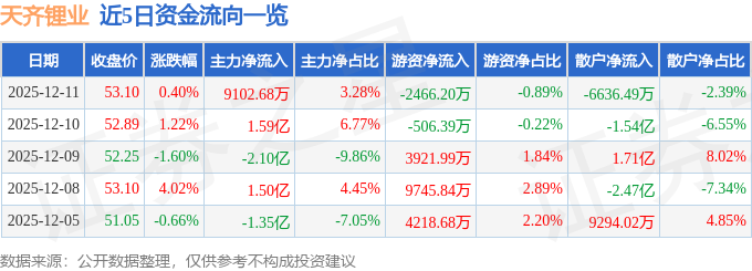 证券之星消息,截至2025年12月11日收盘,天齐锂业(002466)报收于53.1元,上涨0.4%,换手率3.51%,成交量51.84万手,成交额27.76亿元。