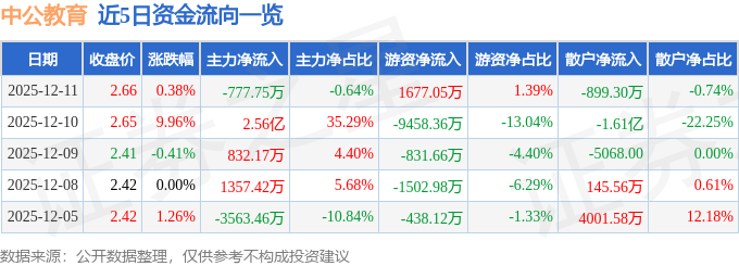 证券之星消息,截至2025年12月11日收盘,中公教育(002607)报收于2.66元,上涨0.38%,换手率8.9%,成交量452.24万手,成交额12.1亿元。