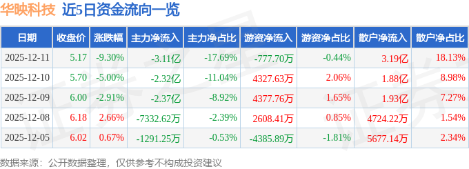 证券之星消息,截至2025年12月11日收盘,华映科技(000536)报收于5.17元,下跌9.3%,换手率12.03%,成交量332.3万手,成交额17.6亿元。