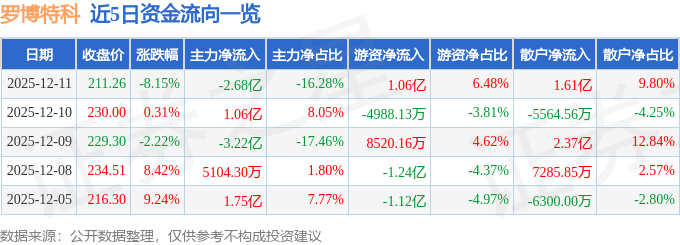 证券之星消息,截至2025年12月11日收盘,罗博特科(300757)报收于211.26元,下跌8.15%,换手率5.11%,成交量7.54万手,成交额16.44亿元。