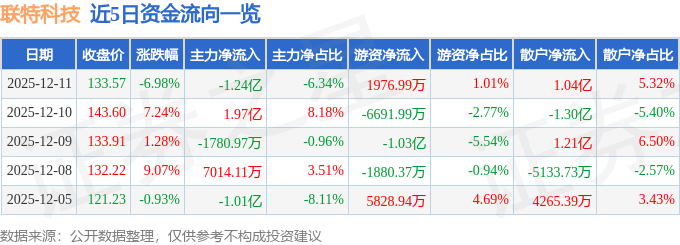 证券之星消息,截至2025年12月11日收盘,联特科技(301205)报收于133.57元,下跌6.98%,换手率21.03%,成交量14.29万手,成交额19.51亿元。