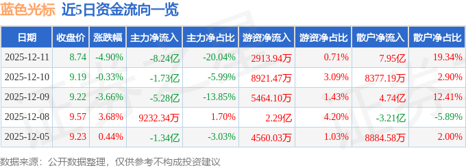 12月11日的资金流向数据方面,主力资金净流出8.24亿元,占总成交额20.04%,游资资金净流入2913.94万元,占总成交额0.71%,散户资金净流入7.95亿元,占总成交额19.34%。