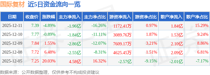 证券之星消息,截至2025年12月11日收盘,国际复材(301526)报收于7.39元,下跌4.89%,换手率11.41%,成交量160.2万手,成交额12.04亿元。