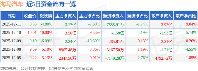 证券之星消息,截至2025年12月11日收盘,海马汽车(000572)报收于9.53元,下跌4.8%,换手率26.05%,成交量427.79万手,成交额43.43亿元。