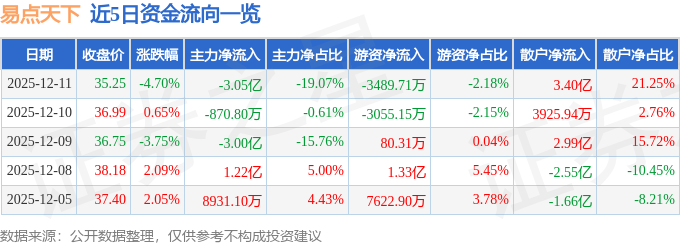证券之星消息,截至2025年12月11日收盘,易点天下(301171)报收于35.25元,下跌4.7%,换手率11.7%,成交量44.55万手,成交额16.01亿元。