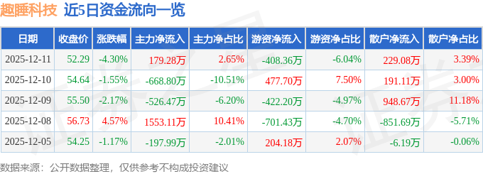 证券之星消息,截至2025年12月11日收盘,趣睡科技(301336)报收于52.29元,下跌4.3%,换手率4.19%,成交量1.28万手,成交额6763.16万元。