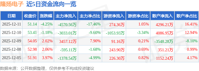 证券之星消息,截至2025年12月11日收盘,隆扬电子(301389)报收于51.14元,下跌4.25%,换手率5.94%,成交量5.03万手,成交额2.62亿元。