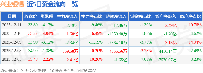 证券之星消息,截至2025年12月11日收盘,兴业银锡(000426)报收于33.8元,下跌4.17%,换手率3.75%,成交量66.55万手,成交额23.18亿元。