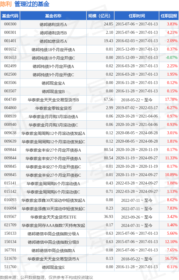 陈利女士:中国国籍,硕士,毕业于上海财经大学数量经济学专业。曾任职于德邦证券、德邦基金从事固定收益相关工作。2017年1月加入华泰证券(上海)资产管理有限公司,现担任基金经理。2018年5月22日起任华泰紫金天天金交易型货币市场基金基金经理。2020年8月5日担任华泰紫金周周购12个月滚动持有债券型发起式证券投资基金基金经理。2020年11月19日至2024年9月27日担任华泰紫金丰安27个月定期开放债券型发起式证券投资基金基金经理。2022年3月28日至2024年9月27日任华泰紫金周周购6个月滚动持有债券型发起式证券投资基金基金经理。2022年7月11日起任华泰紫金添鑫30天滚动中短债债券型发起式证券投资基金的基金经理。2019年7月2日至2022年3月16日任华泰紫金零钱宝货币市场基金的基金经理。