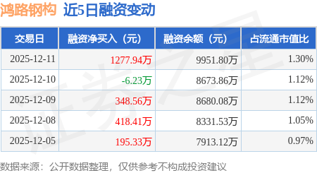 证券之星消息,12月11日,鸿路钢构(002541)融资买入1837.36万元,融资偿还559.42万元,融资净买入1277.94万元,融资余额9951.8万元,近20个交易日中有16个交易日出现融资净买入。