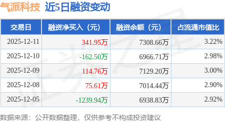 证券之星消息,12月11日,气派科技(688216)融资买入653.7万元,融资偿还311.75万元,融资净买入341.95万元,融资余额7308.66万元。