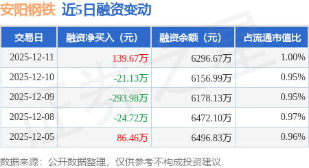 证券之星消息,12月11日,安阳钢铁(600569)融资买入380.6万元,融资偿还240.92万元,融资净买入139.67万元,融资余额6296.67万元。