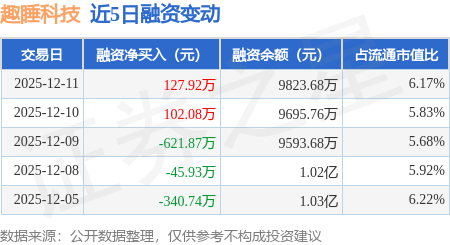 证券之星消息,12月11日,趣睡科技(301336)融资买入690.89万元,融资偿还562.97万元,融资净买入127.92万元,融资余额9823.68万元。