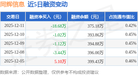 证券之星消息,12月11日,同辉信息(920090)融资买入27.69万元,融资偿还46.37万元,融资净卖出18.68万元,融资余额375.18万元。