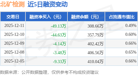证券之星消息,12月11日,北矿检测(920160)融资买入164.36万元,融资偿还213.49万元,融资净卖出49.13万元,融资余额308.66万元。