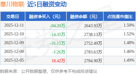 证券之星消息,12月11日,秦川物联(688528)融资买入115.86万元,融资偿还210.06万元,融资净卖出94.2万元,融资余额2643.93万元。