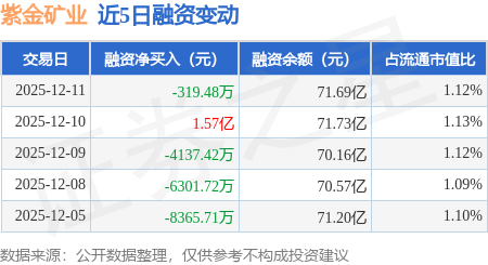 证券之星消息,12月11日,紫金矿业(601899)融资买入5.47亿元,融资偿还5.5亿元,融资净卖出319.48万元,融资余额71.69亿元。