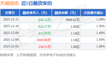 证券之星消息,12月11日,天威视讯(002238)融资买入1580.12万元,融资偿还2216.64万元,融资净卖出636.52万元,融资余额9968.61万元,近20个交易日中有11个交易日出现融资净买入。
