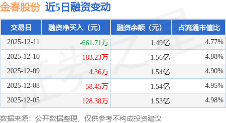 证券之星消息,12月11日,金春股份(300877)融资买入540.64万元,融资偿还1202.34万元,融资净卖出661.71万元,融资余额1.49亿元。