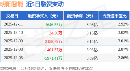 证券之星消息,12月11日,明阳智能(601615)融资买入6381.69万元,融资偿还8028.25万元,融资净卖出1646.55万元,融资余额8.98亿元,近20个交易日中有12个交易日出现融资净买入。