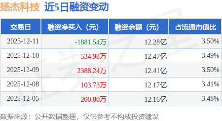 证券之星消息,12月11日,扬杰科技(300373)融资买入5705.37万元,融资偿还7586.91万元,融资净卖出1881.54万元,融资余额12.28亿元。