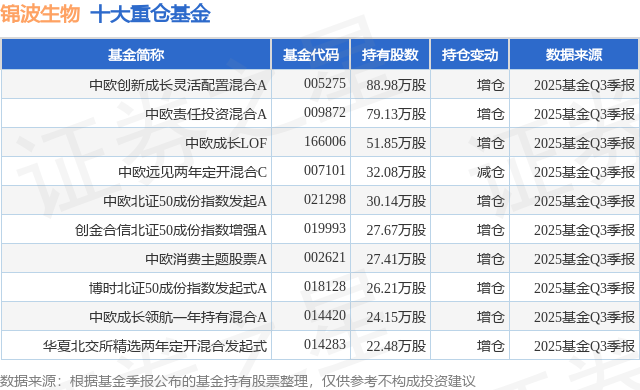 根据2025基金Q3季报公募基金重仓股数据,重仓该股的公募基金共47家,其中持有数量最多的公募基金为中欧基金的中欧创新成长灵活配置混合A。中欧创新成长灵活配置混合A目前规模为21.65亿元,最新净值1.8721(12月11日),较上一交易日上涨0.17%,近一年上涨28.55%。该公募基金现任基金经理为王培 尹为醇。王培在任的基金产品包括:中欧行业成长混合(LOF)A,管理时间为2017年7月26日至今,期间收益率为121.74%;中欧启航三年混合A,管理时间为2019年12月24日至今,期间收益率为47.19%;中欧责任投资混合A,管理时间为2020年9月10日至今,期间收益率为-4.48%。尹为醇在任的基金产品包括:中欧责任投资混合A,管理时间为2022年7月7日至今,期间收益率为4.08%;中欧成长领航一年持有混合A,管理时间为2022年7月7日至今,期间收益率为6.18%;中欧行业成长混合(LOF)A,管理时间为2022年7月7日至今,期间收益率为10.22%。