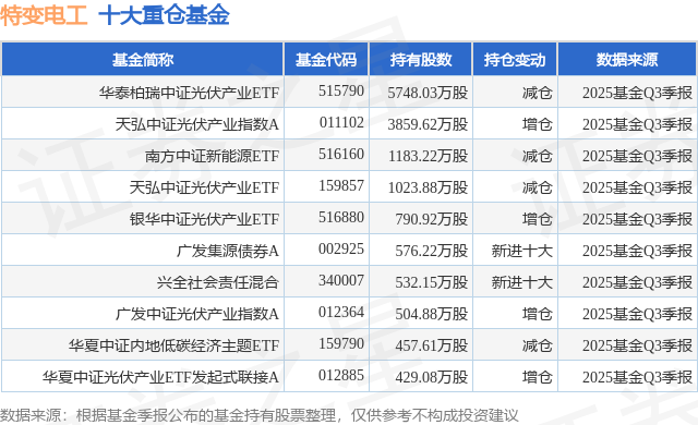 根据2025基金Q3季报公募基金重仓股数据,重仓该股的公募基金共65家,其中持有数量最多的公募基金为华泰柏瑞基金的华泰柏瑞中证光伏产业ETF。华泰柏瑞中证光伏产业ETF目前规模为139.76亿元,最新净值0.9474(12月11日),较上一交易日下跌1.03%,近一年上涨15.26%。该公募基金现任基金经理为李茜 李沐阳。李茜在任的基金产品包括:华泰柏瑞上证红利ETF,管理时间为2019年11月5日至今,期间收益率为48.7%;华泰柏瑞中证港股通50ETF,管理时间为2020年12月30日至今,期间收益率为16.28%;华泰柏瑞中证物联网主题ETF,管理时间为2021年3月31日至今,期间收益率为40.99%。李沐阳在任的基金产品包括:华泰柏瑞光伏ETF联接A,管理时间为2021年8月17日至今,期间收益率为-41.13%;华泰柏瑞中韩半导体ETF(QDII),管理时间为2022年11月2日至今,期间收益率为143.88%;华泰柏瑞纳斯达克100ETF(QDII),管理时间为2023年3月1日至今,期间收益率为109.04%。