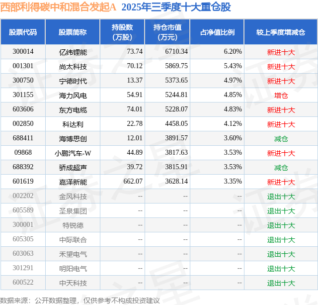 西部利得碳中和混合发起A的前十大重仓股如下: