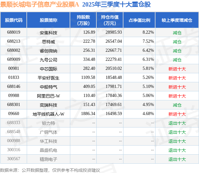 景顺长城电子信息产业股票A的前十大重仓股如下: