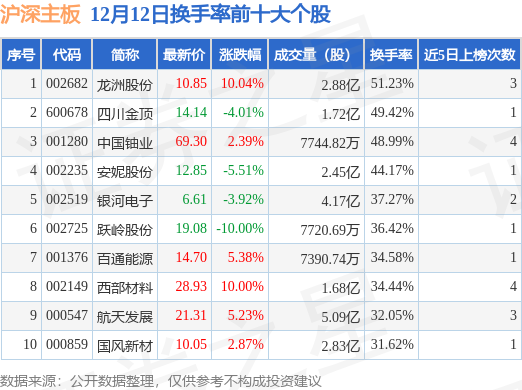 当日沪深主板换手率前10大个股中6只个股收涨,平均涨幅5.98%,其中龙洲股份(002682)以换手率51.23%排第一,5只个股近5个交易日中多次上榜。